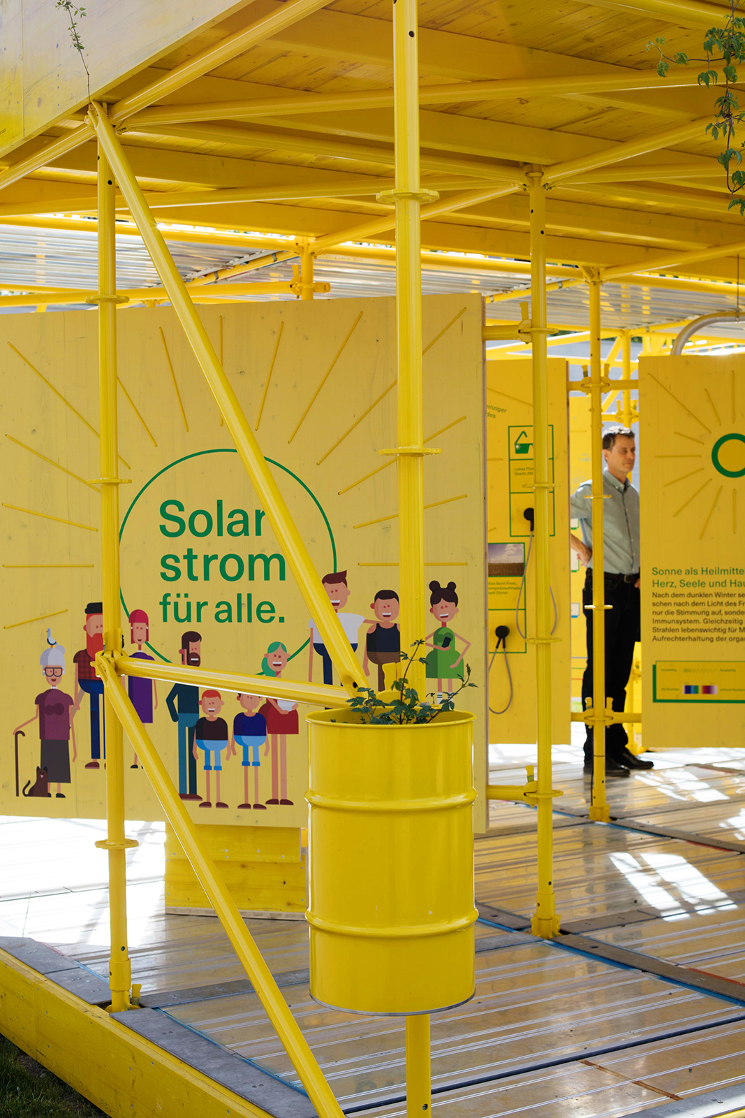 Der ewz-Ausstellungspavillon ermöglicht einen offenen und emotionalen Zugang in das Thema Solarstrom. Die eingefärbten Gerüstelemente verkörpern den unsichtbaren Kern des Themas: die Sonnenstrahlen. Die Ausstellungsgrafik führt das räumliche Vokabular fort und verwendet gelbe Schalungsplatten als Träger. Infografik wird durch Kabel als Illustrationselemente erweitert. Gebäude und Inhalte erzählen so auf offene Weise: Die ewz bringt die Sonnenstrahlen ins Zuhause.
